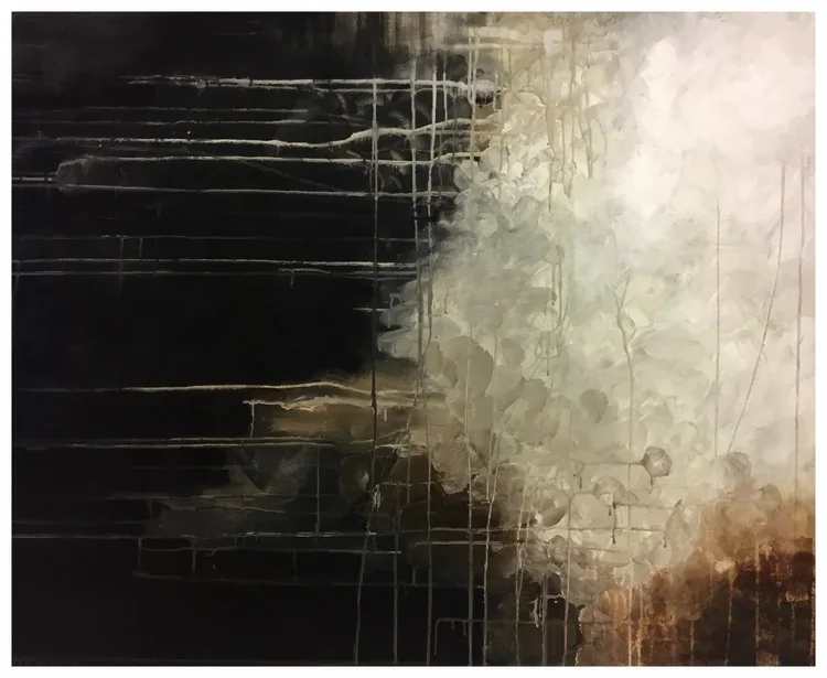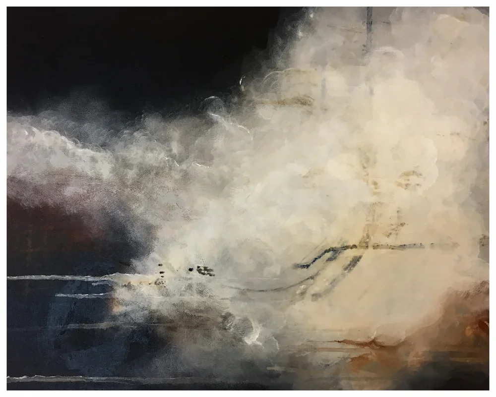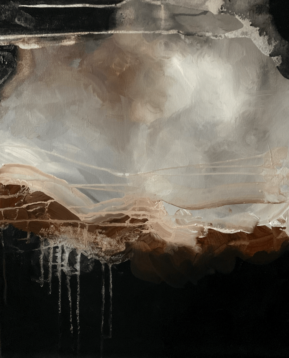 Working within a deliberately restrained range of tones — from deep black through luminous white to the raw warmth of burnt umber — the series explores shifting emotional states, inner tension, and moments of clarity. Although entirely abstract, the works rely on composition, rhythm, and title to suggest emotional terrain rather than describe it.