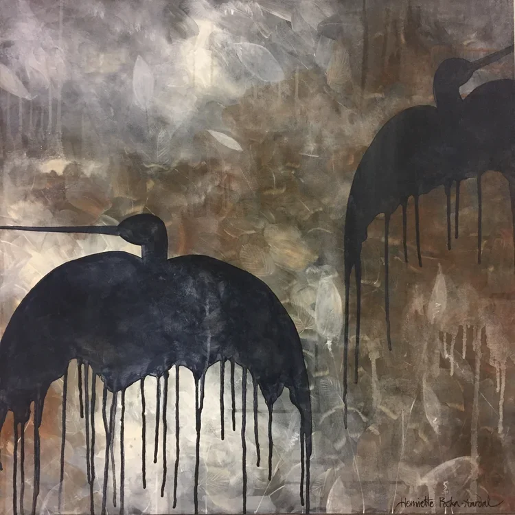 The series began as an intuitive exploration using acrylic, ink, and chlorine — a process that gave rise to the name Ink Birds. Over time, the practice shifted to working exclusively with acrylics, allowing for a more deliberate and sustainable approach while retaining the fluidity essential to the work.